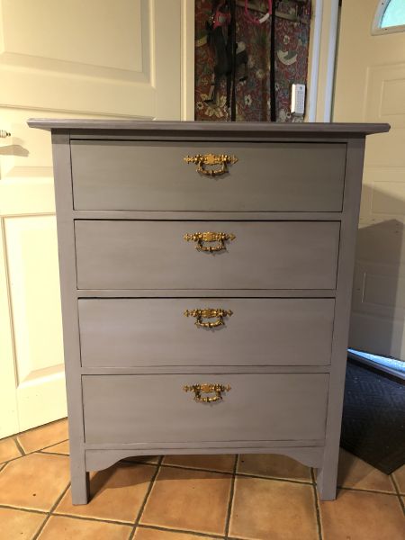 Fyrlådig byrå från början av 1900-talet som jag målat i en gråblå nyans. Lådorna har helgjutna, antika mässingsbeslag och är lätta att dra ut. Bredd/djup: 46 cm