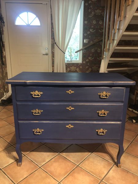 mycket fin trelådig byrå från 30/40-talet som jag renoverat och måla med Annie Sloans Chalk Paint Colour i en djupblå nyans med gulddetaljer. Beslagen är antika helgjutna mässingsbeslag som jag "guldat" - dom är inte original till byrån men finare än dom som fanns! |