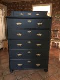 mycket fin trelådig byrå från 30/40-talet som jag renoverat och måla med Annie Sloans Chalk Paint Colour i en djupblå nyans med gulddetaljer. Beslagen är antika helgjutna mässingsbeslag som jag "guldat" - dom är inte original till byrån men finare än dom som fanns! |