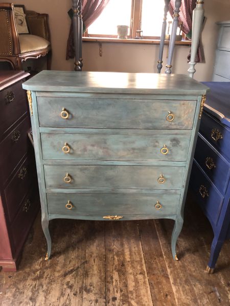 Fyrlådig byrå från ca 1940 i gustaviansk stil som jag målat i en lite "flammig" grön- och guldfärg (Annie Sloans chalk paint colour)Byrån har originalbeslag och lådorna är lätta att dra ut.